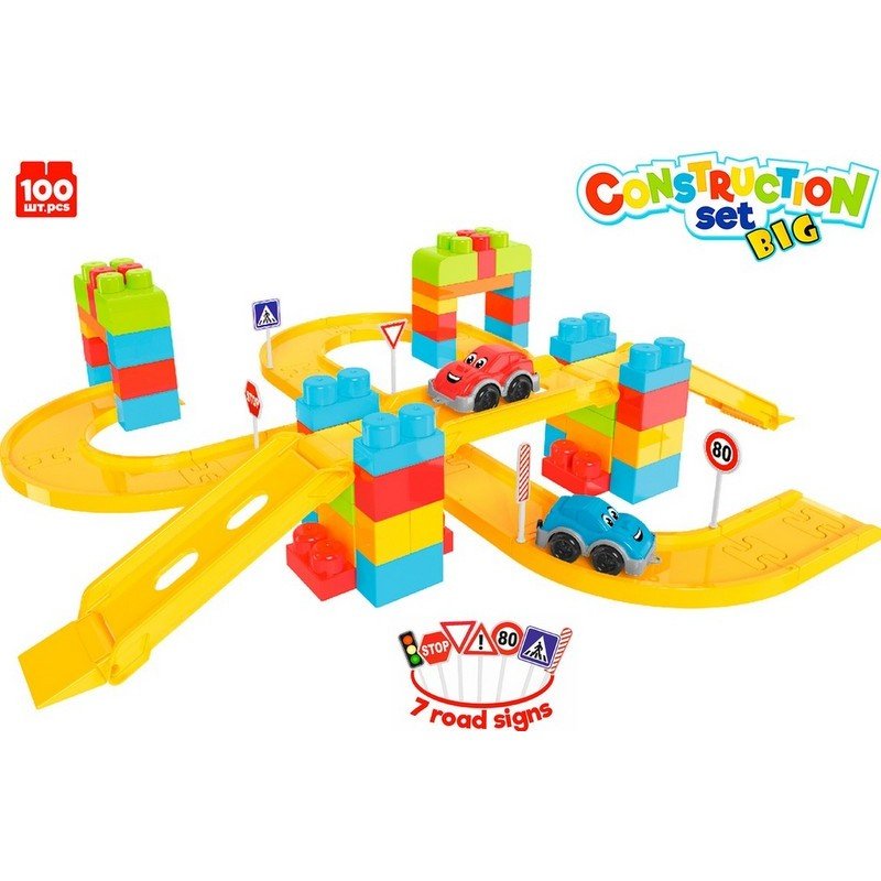 Комплектът съдържа: 100 части, включително писта, колички и разнообразни пътни знаци.
