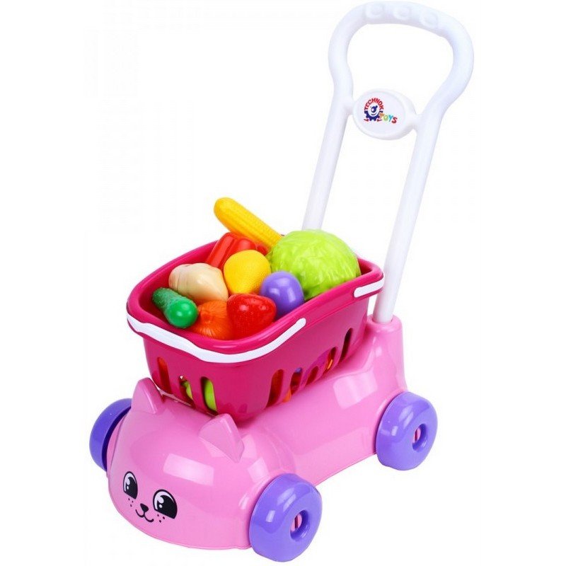 Количката „Коте“ в розово е очарователна играчка за малки деца, която комбинира забавление с ролеви игри. Включената кошница с плодове позволява на децата да се упражняват в подреждане, сортиране и имитация на пазаруване, като същевременно развиват въображението и фината моторика.