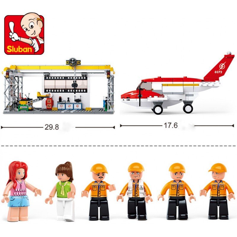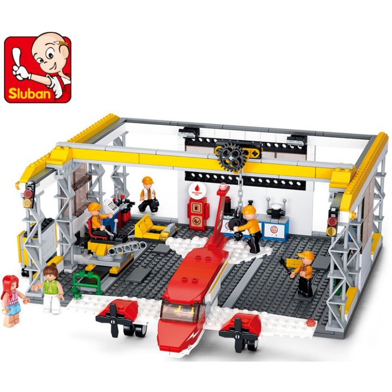 Конструктор Sluban Авиация Самолет в Ремонтен Хангар 599 ел. с 6 фигурки 52х38х8