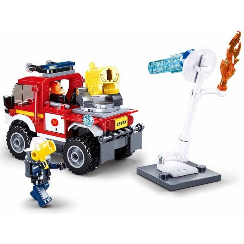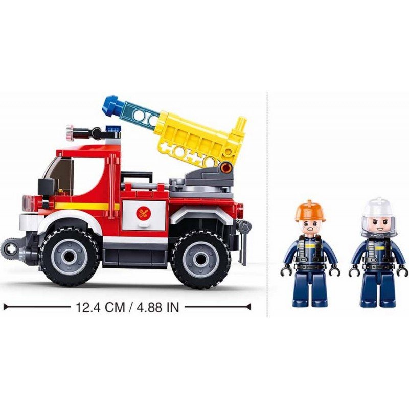 Комплектът включва пожарна кола и учебна мишена, предназначена за тренировки по точност и координация. Детайлният дизайн позволява пресъздаване на реалистични пожарникарски сценарии и обучения.