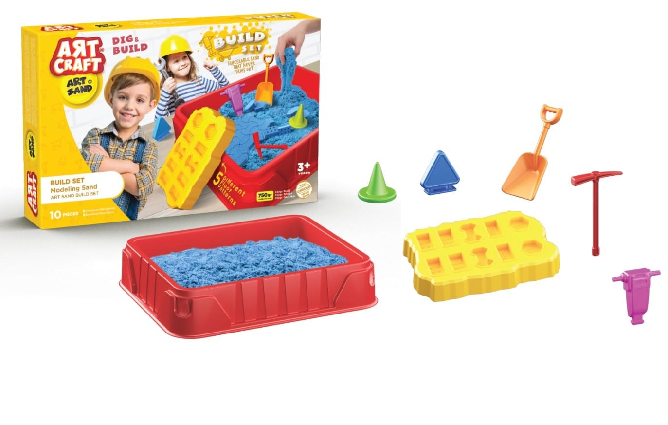 Коплект кинетичен пясък с форми за строеж и 750 гр кинетичен пясък 4 бр форми и 1 кутия за работа 4 пътни знаци и игрално поле 43х7х27