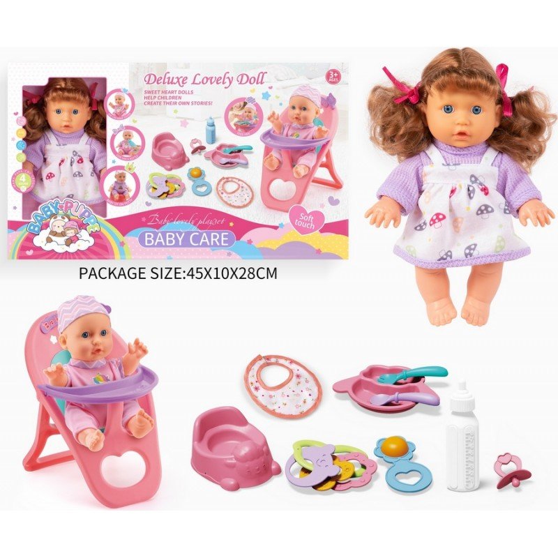 Куклата издава 4 весели мелодии, които правят играта още по-забавна, а включеното столче за хранене позволява детето да се грижи за своето бебе по реалистичен начин.