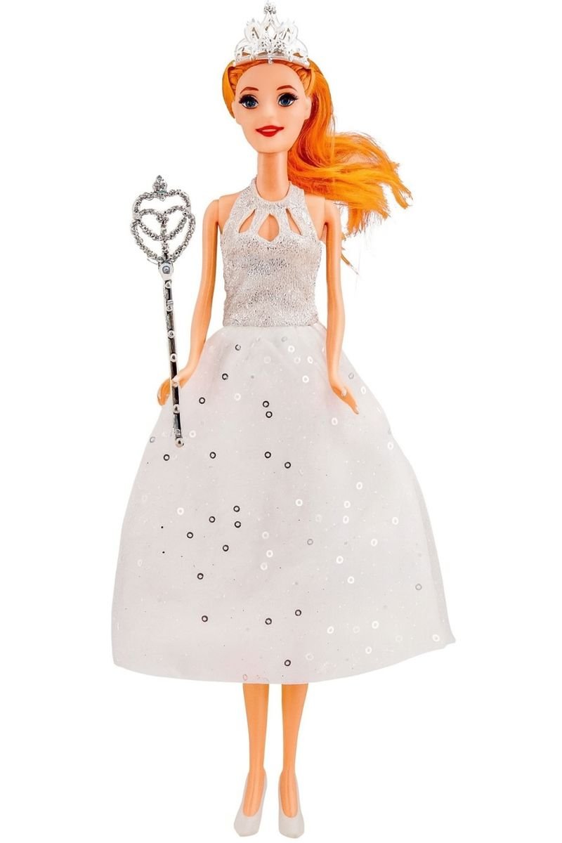 Куклата е с красиво оформена прическа, украсена с корона (тиара), която подчертава нейния принцески облик. Фината рокля е допълнена със сребристи акценти, а аксесоарът – декоративен жезъл/скиптър – добавя още повече блясък и възможности за игра.