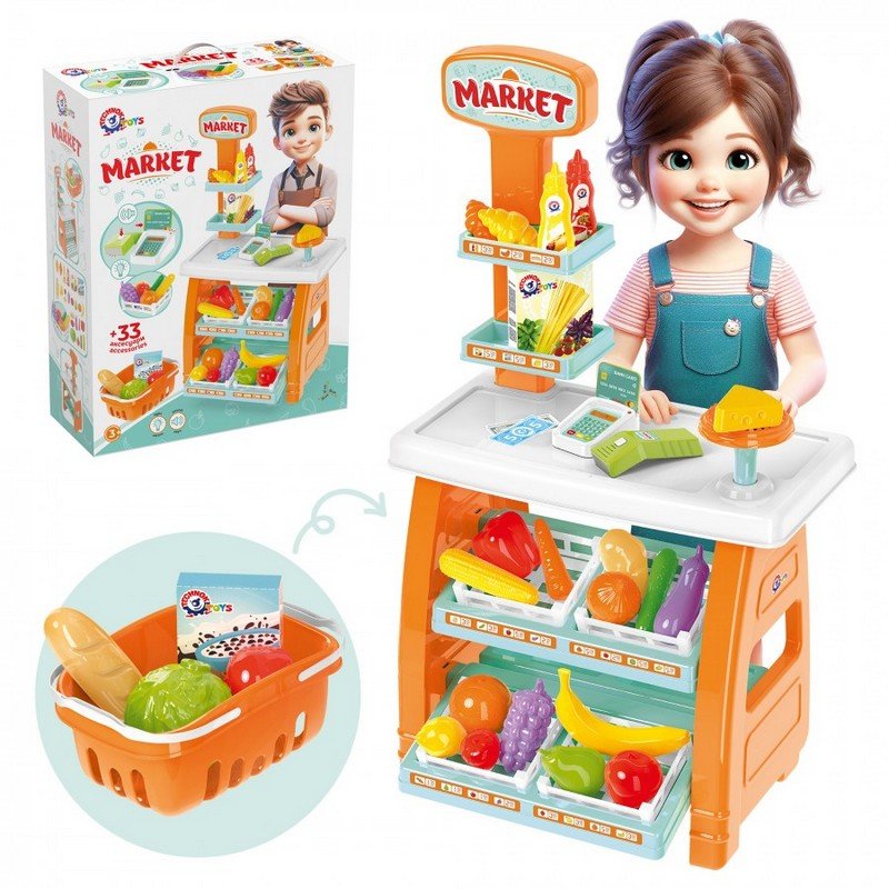 Комплектът включва касов апарат със светлинни и звукови ефекти, които правят играта още по-реалистична и вълнуваща. Детето може да играе ролята както на продавач, така и на клиент, да „сканира“ продукти, да издава касови бележки и да работи с пари – точно като в истински магазин.