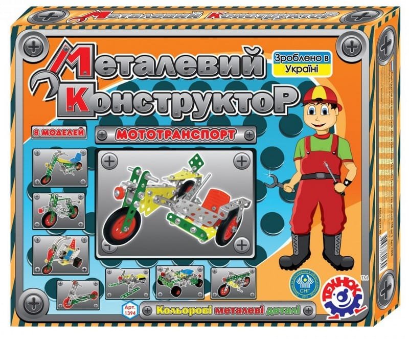 Метален конструктор 30х25х4 с болтове гайки инструменти и гуми за направа на мото техника 8 модела