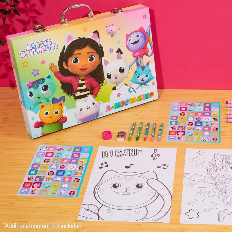 Комплектът „Супер куфар за рисуване“ включва 138 елемента за творчество и рисуване, идеални за деца. Куфарът е снабден с метални закопчалки и удобна дръжка, което го прави лесен за пренасяне и съхранение. Темата Къщата за кукли на Габи добавя забавен и вдъхновяващ елемент за малките творци.